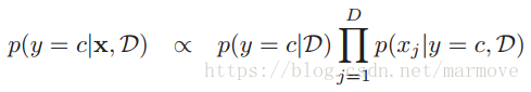 ,这个式子的意思我觉得写得不是很清楚:其中数据是已知的,左边就是属于类里面的概率。右边第二项是在数据