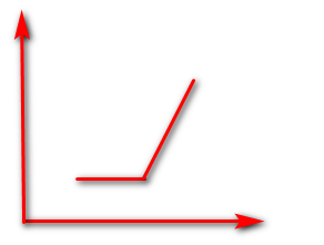 这样图形的激活函数,在深度学习里面称之为ReLU,在深度学习里面用的最多的激活函数,因为它最拟人,给它输入小的时候没什么反应,输入越大,反应就越大。比如别人轻轻摸你一下,可能没什么反应,或者小风从你皮肤上吹一下,没什么反应,随着风力的不断的加大,你会觉得越来越疼。那么它就是ReLU激活函数的一个变化。