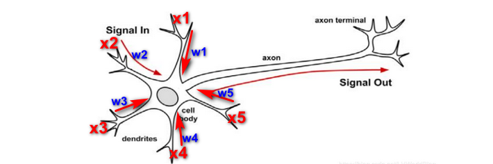 Cell body可以理解为是一个细胞,一个神经元,signal in输入信号,dendrites是突触,这些输入信号的连线都连接到中间的神经元,它们都做了输入,跟机器学习联系一下,signal out输出,可以写成y,signal in可以写成x1,x2,x3,x4,x5,称每个x为输入特征,或者叫维度,每一个x都对应着一个维度,维度越多,最后影响y结果的因素就越多。