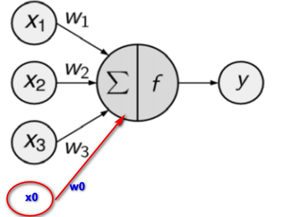 首先它有加和,然后经过变化、输出,每个连线上有对应的w权重值。在这里面可以单独加一条线对应w0,那么它前面的输入就是1。所以每个神经元我们也可以给它加一个截距x0=1。