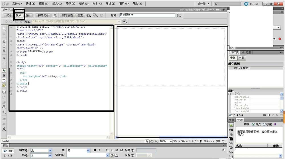 2、然后给表格加一个背景,就是我们自己需要的背景素材。方法是,选中单元格。然后选择拆分,这时候,可以看到,栏目的右侧是我们设计的页面,左面就变成了一个代码页。