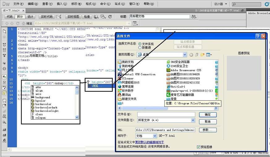 3、这时候,看一下左侧的代码页面,有一个“td”,鼠标放在这里,然后按一下空格。会出现很多选项,这里面就是单元格的参数,找到background,双击确定,出现“浏览”之后,选择自己的背景图像。