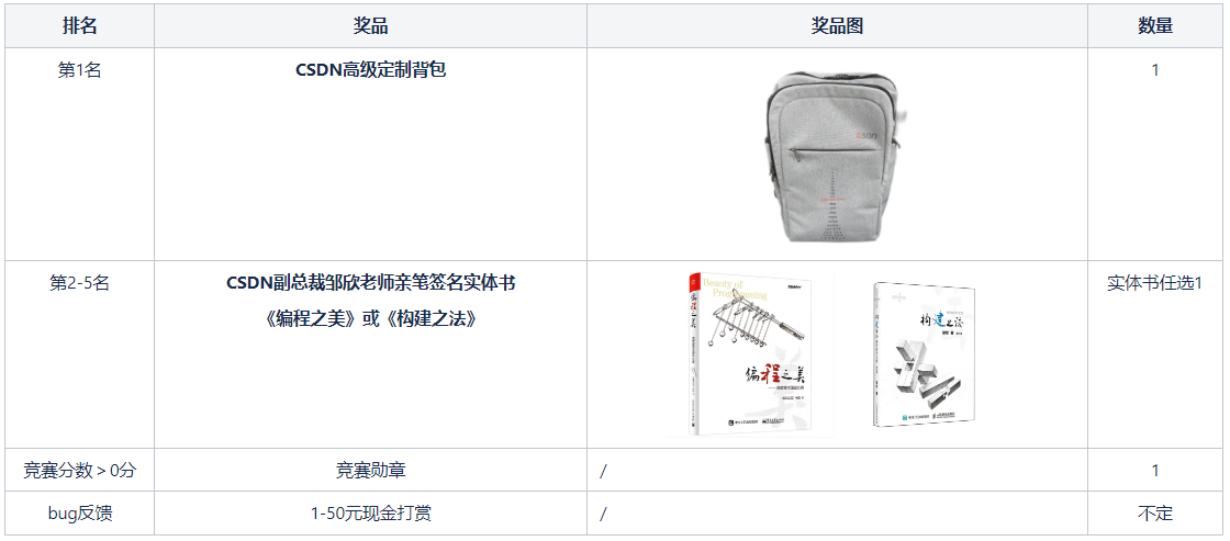 注:发布竞赛相关博客,内容创作方向可以围绕竞赛相关,如本次竞赛的bug,对CSDN竞赛的建议,以往参加各类编程竞赛的比赛经历等等,高质量博客有机会获得现金打赏或实物奖品哦(竞赛获奖用户必须发布博客才可以获得相关奖品)