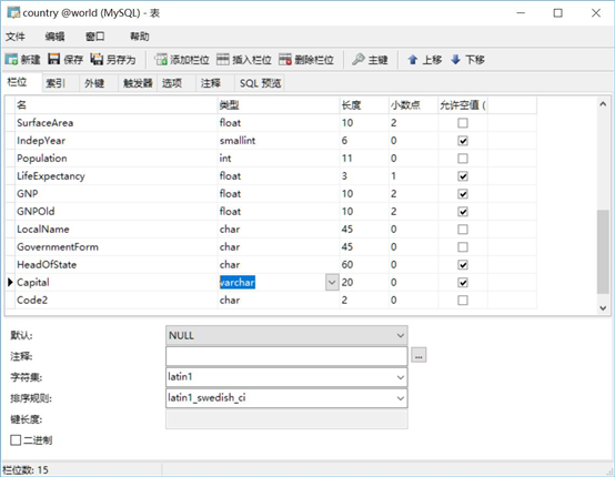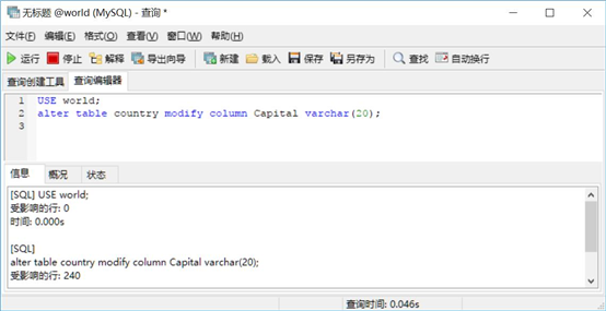 4.将数据库world中country表的capital字段的数据类型改为varchar(20).