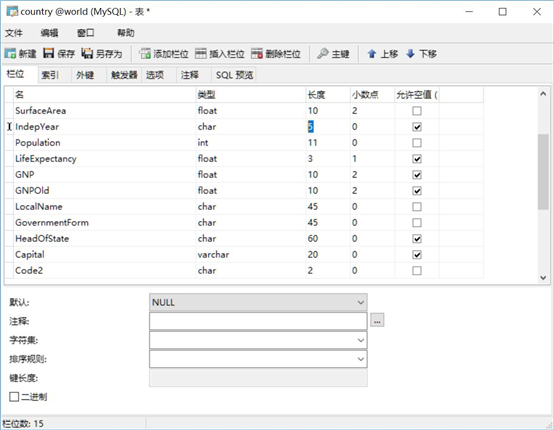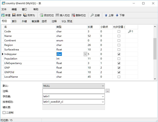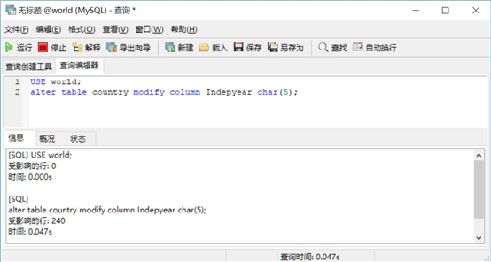 1.用Navicat和SQL语言两种方式将数据库world中Indepyear字段的数据类型改为 char(5)