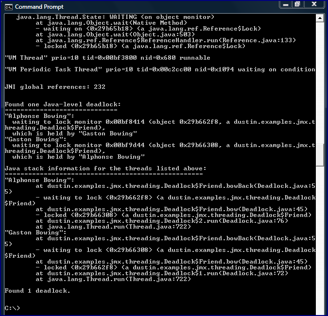 不幸的是,利用多个线程的Java应用程序有时可能会陷入可怕的死锁状态。 幸运的是,Java平台使死锁检测相对容易。 实际上,内置的(自J2SE 5起 ) ThreadMXBean (通过JMX公开的PlatformManagedObject )使此信息可通过findDeadlockedThreads()和findMonitorDeadlockThreads()方法供任何使用JMX的客户端使用。 通用的“ JMX客户端”(例如JConsole和VisualVM)使用它来提供有关检测到的死锁的信息,但是可以编写自定义工具和脚本来提供相同的详细信息。 在本文中,我将结合使用Groovy和Attach API来检测本地运行的JVM进程的死锁线程。