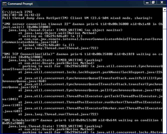 JConsole和Java VisualVM使识别死锁中涉及的线程变得容易。 但是,当使用命令行工具而不是基于GUI的工具时, jstack是一个明显的选择。 再次使用先前为该特定进程标识的pid(在我的情况下为3792),可以简单地键入jstack 3792来查看该应用程序的线程转储。 接下来的两个屏幕快照显示了其中的一部分,第一个快照显示了正在运行的命令以及输出的开始,第二个快照显示了与死锁相关的部分。