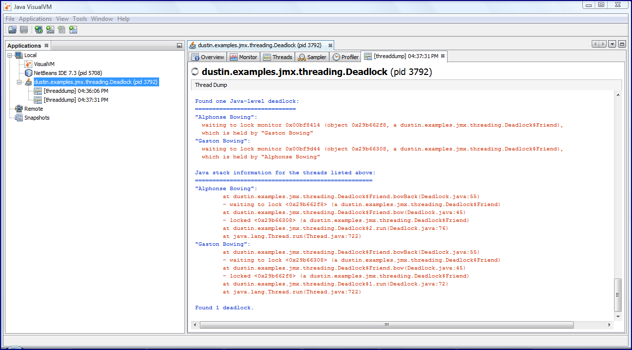 就像JConsole所做的那样,VisualVM还在提供的线程转储中指示两个弯曲线程正在互相等待,并且为每个标识为参与致命拥抱的线程提供了“ Java堆栈信息”。