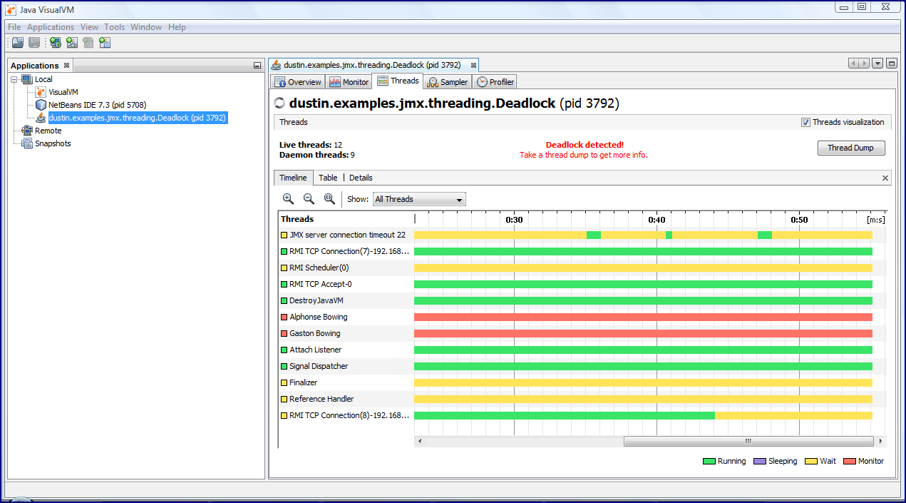 可以使用jvisualvm命令启动Java VisualVM,然后可以选择下一个屏幕快照中所示的Java进程。 请注意,VisualVM会自动检测VisualVM的“ 线程 ”选项卡上的死锁,并以红色字体显示一条消息,指出这一点。