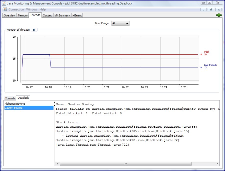 下一个屏幕快照显示,这个简单的应用程序在两个线程之间陷入了僵局。