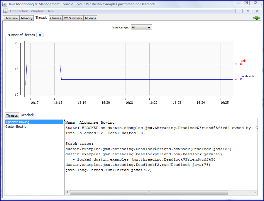 紧邻的上一个屏幕快照带有两个感兴趣的线程。 在经过修改的代码示例中,我将它们命名为“ Gaston Bowing”和“ Alphonse Bowing”,以使其在JConsole和其他工具中更容易找到。 如果我没有在示例中提供这些显式名称(Java教程中的原始示例未提供),则它们将被更通用的名称“ Thread-0”和“ Thread-1”引用。 加载JConsole并提供“线程”选项卡后,我可以单击“检测死锁”按钮以查看接下来的两个屏幕快照(每个选定的两个线程各一个)中的信息。