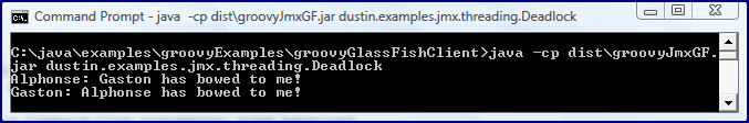 上面的Groovy脚本将10作为要提供的堆栈跟踪信息的最大深度,因为它提供的详细信息与JConsole,VisualVM和jstack中提供的信息类似。 当然,这种方法的优势在于,这里打印到标准输出的任何数据都可以在运行时决策中使用,并可以通过Java或Groovy代码以编程方式对其进行操作。 下一个屏幕快照显示了针对本文之前使用的死锁应用程序运行此脚本的输出。