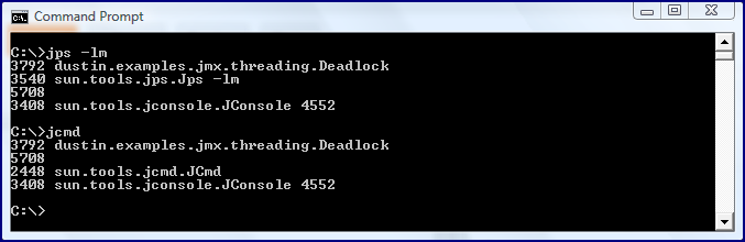 即使我们不知道此应用程序旨在演示死锁,但它永远不会结束或更改状态这一事实很好地表明它已陷入死锁。 我们可以使用JMX来确定这一点。 无论我们是使用JMX客户端,jstack还是其他机制来确定死锁,我们都可能需要Java进程的pid(进程ID),因此下一个屏幕快照指示同时使用这两个jps (pid为3792)和jcmd (后者仅自JDK 7起可用)。