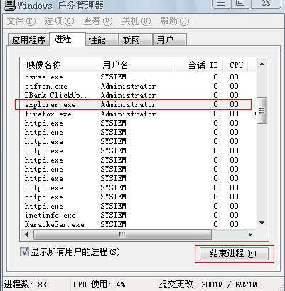 3、删除完其他软件的节点后,可以重启电脑或者在任务管理器中结束explorer.exe进程(如下图),