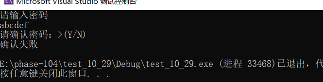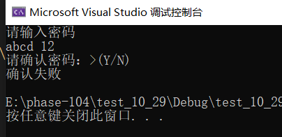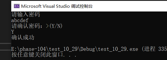 #include<stdio.h> int main() { char password [20] = { 0 }; printf("请输入密码n"); scanf("%s", &password); printf("请确认密码:>(Y/N)n"); getchar(); int ch = getchar(); if (ch =='Y') { printf("确认成功n"); } else { printf("确认失败n"); } return 0;这里的getchar是清理n,然后就可以输入了