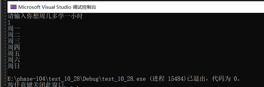 #include<stdio.h> int main() { int day = 0; printf("请输入你想周几多学一小时n"); scanf("%d", &day); switch (day) { case 1: printf("周一n"); break; case 2: printf("周二n"); break; case 3: printf("周三n"); break; case 4: printf("周四n"); break; case 5: printf("周五n"); break; case 6: printf("周六n"); break; case 7: printf("周日n"); break; } return 0; }