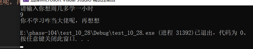 #include<stdio.h> int main() { int day = 0; printf("请输入你想周几多学一小时n"); scanf("%d", &day); switch (day) { case 1: printf("周一n"); break; case 2: printf("周二n"); break; case 3: printf("周三n"); break; case 4: printf("周四n"); break; case 5: printf("周五n"); break; case 6: printf("周六n"); break; case 7: printf("周日n"); break; default: printf("你不学习咋当大佬呢,再想想n"); break; } return 0; }