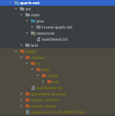 “quark-net”的下一级有两个目录,一个是“src”,一个是“target”。简单的理解,“src”就是常规的“源代码”存在的最上级目录,而“target”就是“编译”后生成的文件位置的最上级目录。