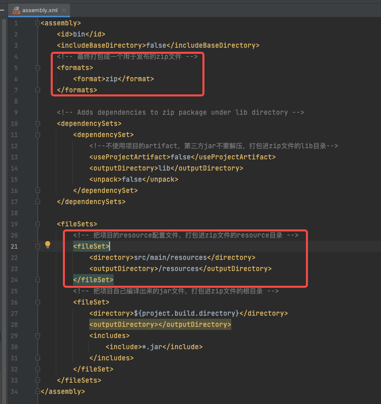 fileSets中的第二个fileSet的配置是将JAR包也放到zip包的根目录下。至此,JAR包和外置配置文件的相对路径就形成了。