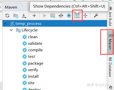 在界面右侧可找到Maven和Show Dependencies的图标,点击后即可查看当前maven模块的依赖结构图