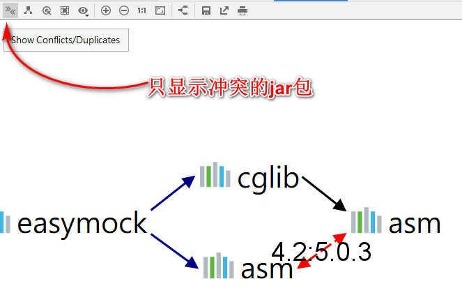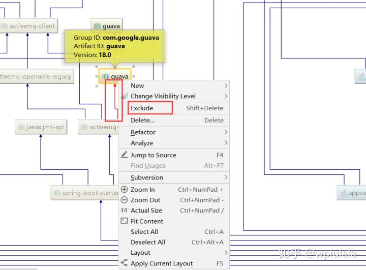 其中需要注意到,图中的红色实线是冲突的,可以像下图那样,右键,排除,他就会自动在pom文件里面给exclud了。