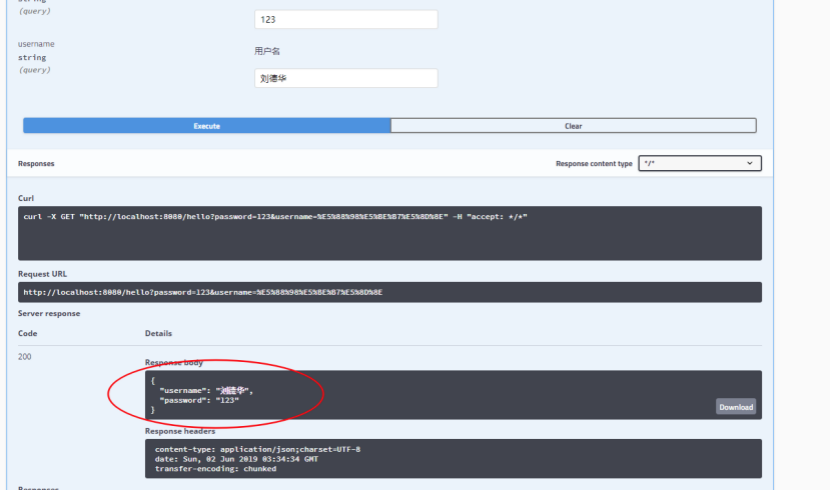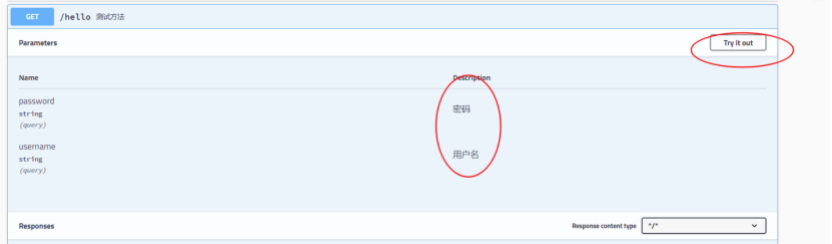 我们 会发现参数的username 和password 通过@ApiImplicitParams 注解 也给加上了注释 接下来 我们 点击try it out 看下图 点击输入参数后 点击Execute