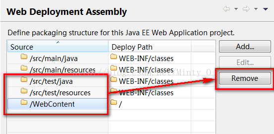 7、项目右键——“Properties”——“Deployment Assembly”,将“/WebContent”和两个test都remove;