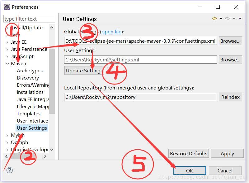 第二步:打开window—>preferencs—>Maven—>User Settings,将settings.xml加载到本地,点击update Setting,点击“OK”,如下图。