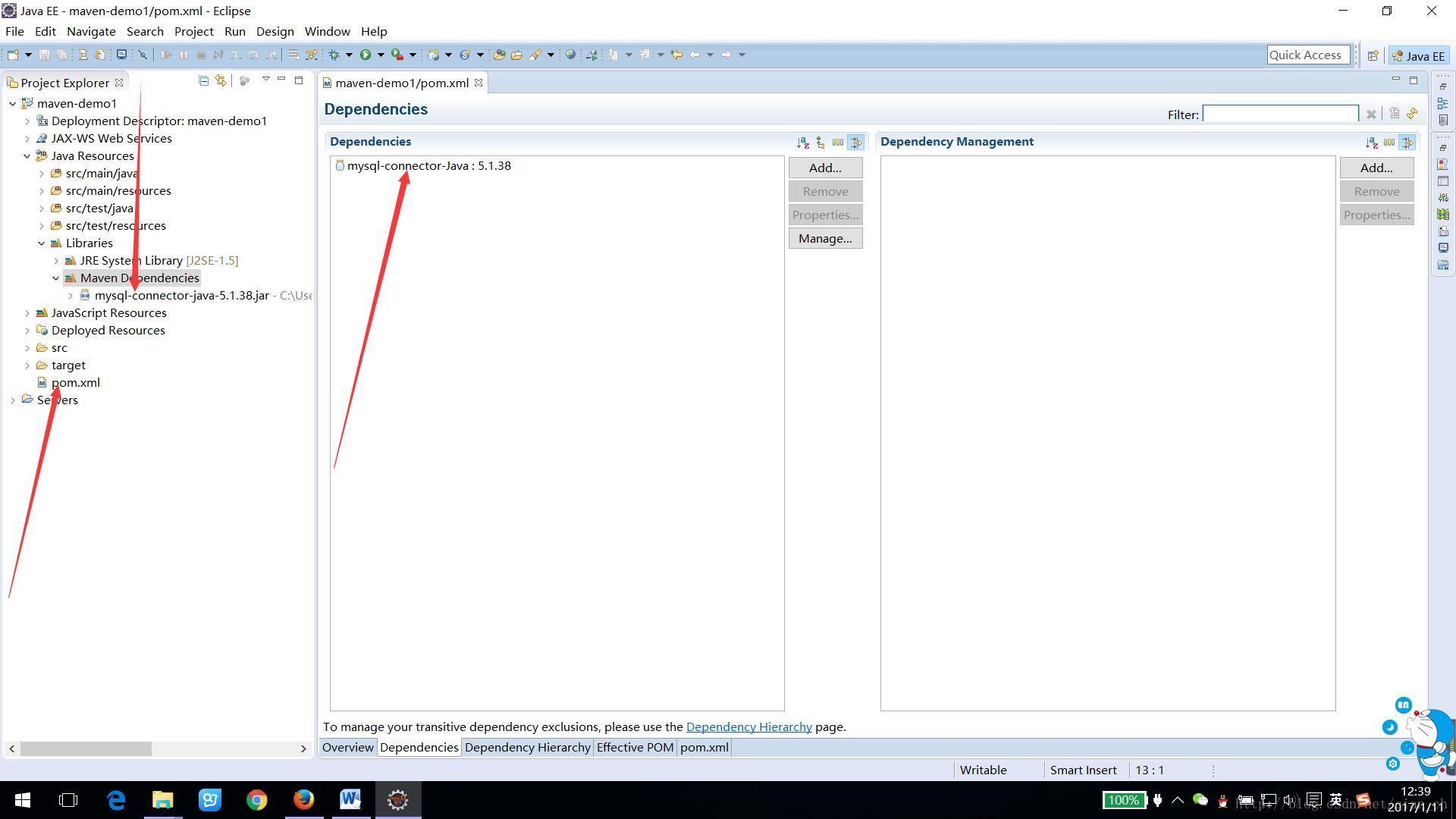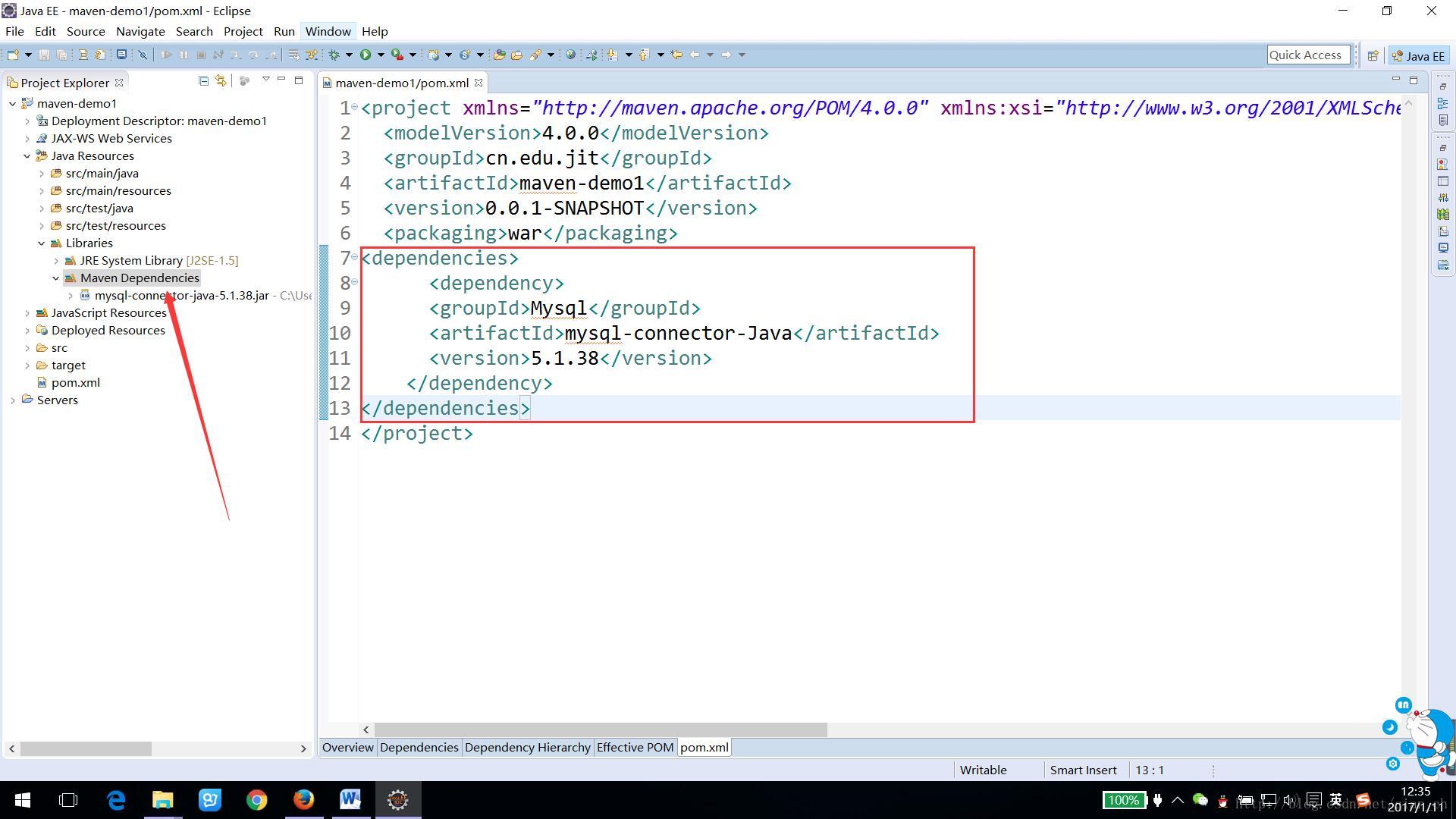 3.比如添加MySQL驱动jar包mysql-connector-Java是5.1.38版本的,将如下代码复制到pom.xml文件中,如下: