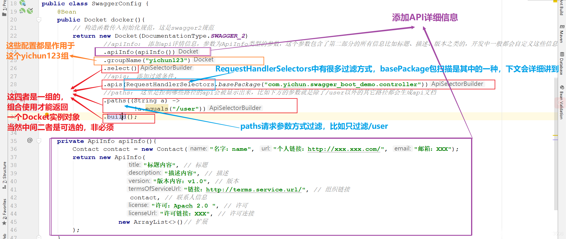 }//springfox允许我们将信息组合成一个ApiInfo的类,作为构造参数传给Docket