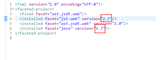 6继续在navigator视图下,打开org.eclipse.wst.common.project.facet.core.xml文件,将jdk版本改为当前系统版本号,将jst.web改为2.5,如图
