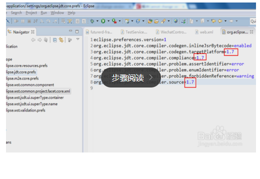 4切换视图为navigator,打开org.eclipse.jdt.core.prefs文件,将jdk版本号改为当前系统jdk版本号,如图