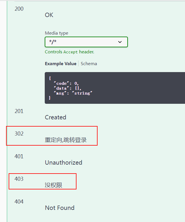 @ApiResponse(responseCode = HttpCodeStatus.REDIRECT, description = "重定向,跳转登录"),