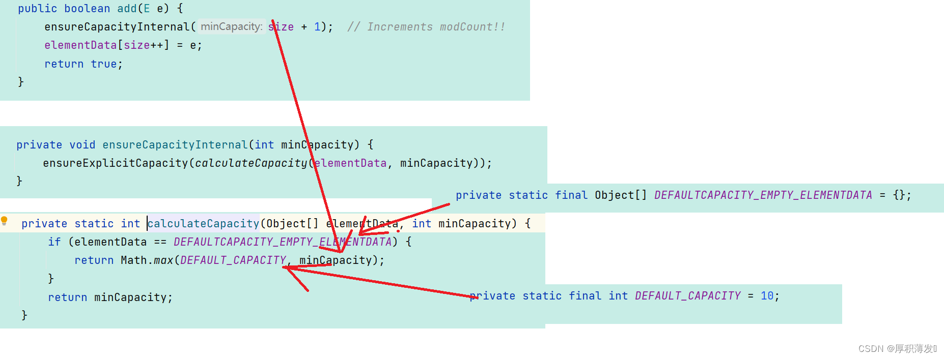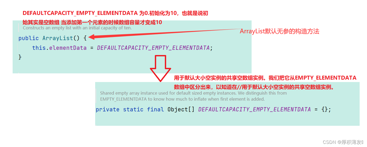 通过读源码和源码注释可以知道:数组默认容量是0(也就是没有添加元素的时候数组容量为0),而当我们添加了元素之后数组容量就变为了10;