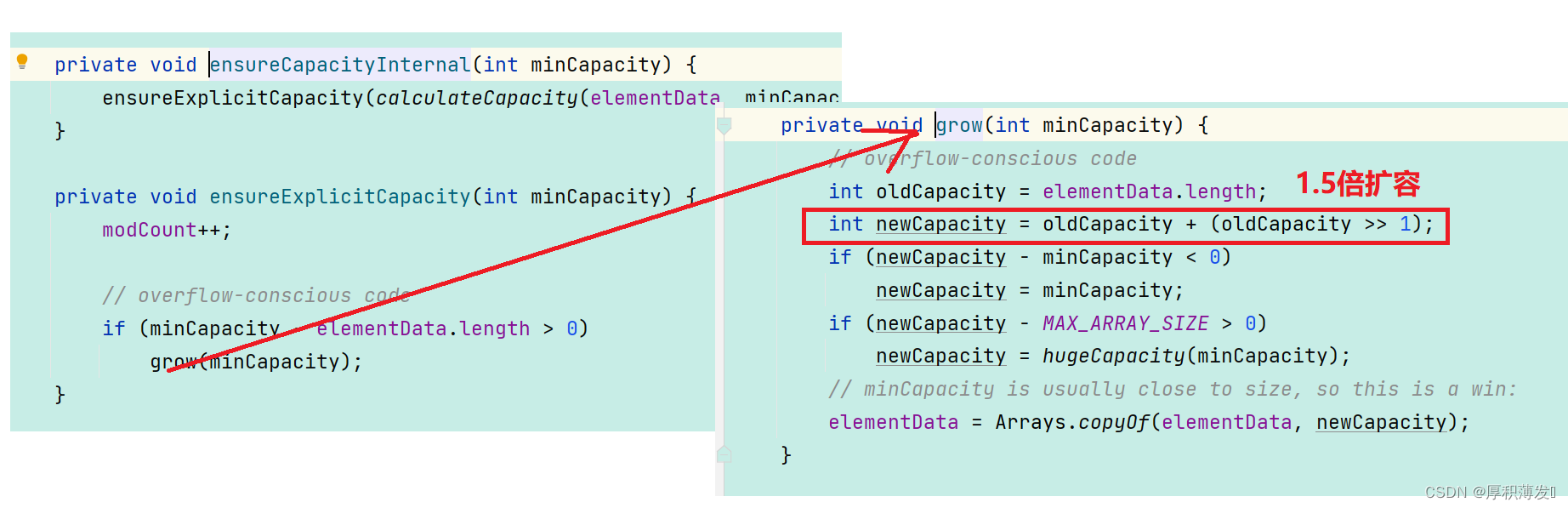 add方法-》ensureCapacityInternal()当 要 add 进第 1 个元素时,minCapacity 为 1,在 Math.max()方法比较后,minCapacity 为 10。)-》直到添加第 11 个元素,minCapacity(为 11)比 elementData.length(为 10)要大。进入 grow 方法进行扩容。-》int newCapacity = oldCapacity + (oldCapacity >> 1),所以 ArrayList 每次扩容之后容量都会变为原来的 1.5 倍左右(oldCapacity 为偶数就是 1.5 倍,否则是 1.5 倍左右)!-》