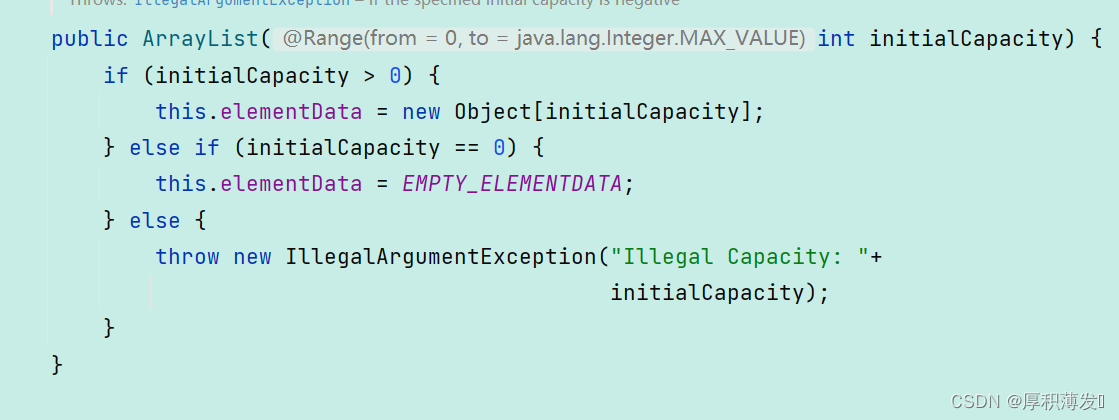 参数为initialCapacity,意思是用户可以自定义这个数组的容量大小,如果参数为0,这个数组就为空,其他情况非法报异常。