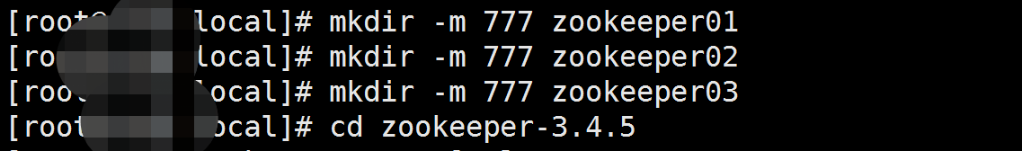 2、为3个实例分别创建不同路径: mkdir -m 777 zookeeper01,mkdir -m 777 zookeeper02,mkdir -m 777 zookeeper03