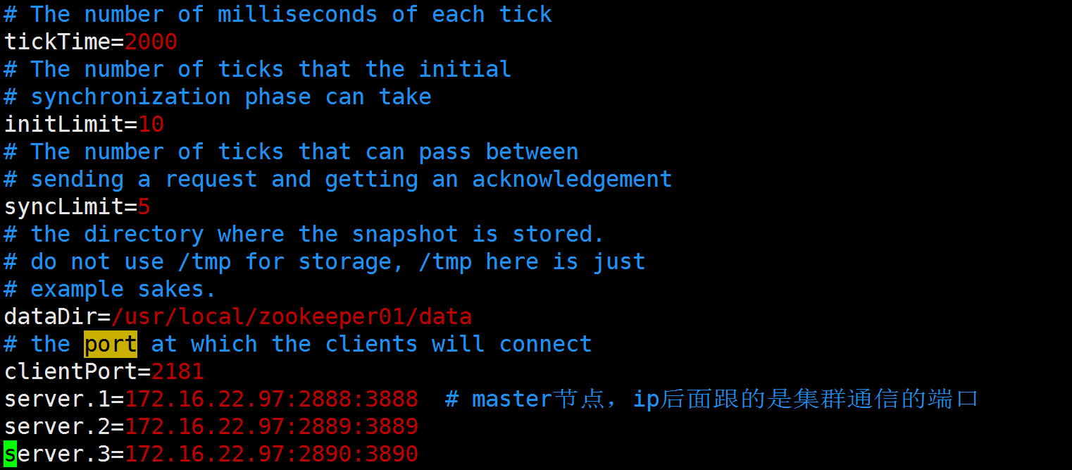 此外172.16.22.97代表ip地址,2888代表选择Leader的端口,3888代表zookeeper集群通信的端口;