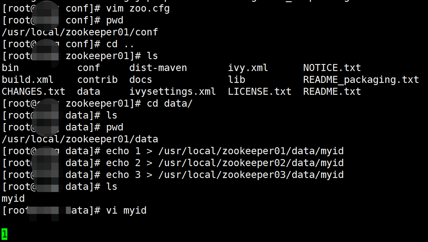例如,在zookeeper01实例中配置server.1=172.16.22.97:2888:3888,那么他的dataDir=/usr/local/zookeeper01/data路径下面
