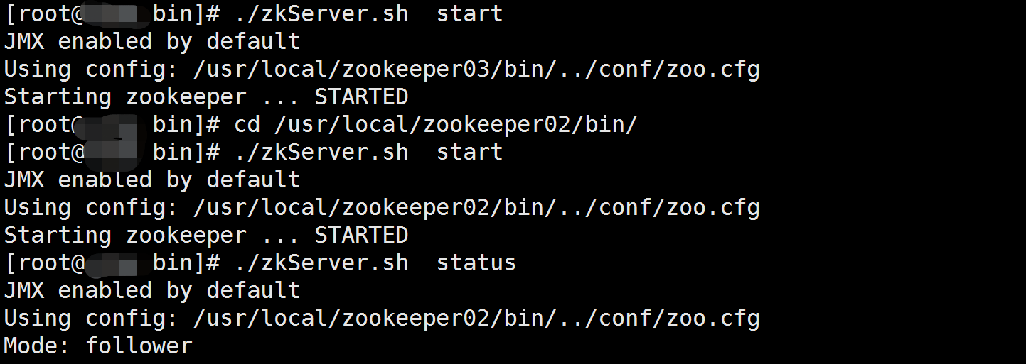 5、基本配置完成,现在开始启动,各个zookeeper实例,进入到各个bin目录下,分别启动 ./zkServer.sh start