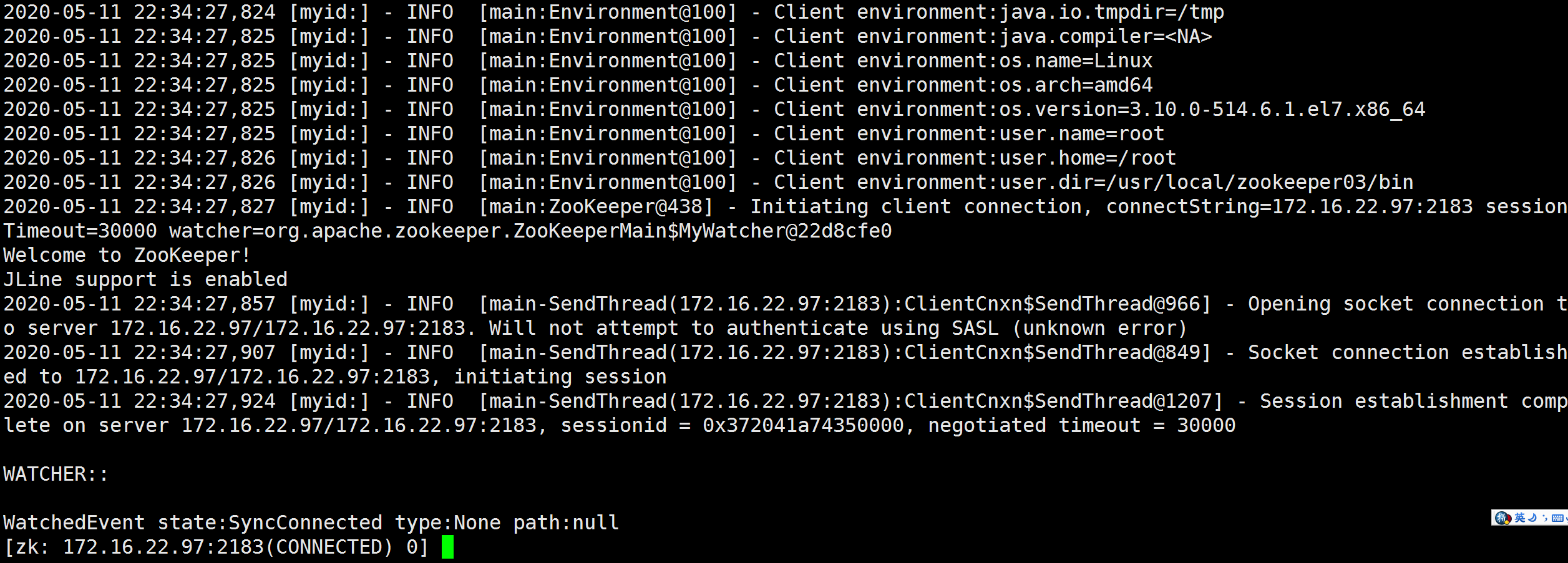 然后通过客户端登录一下,./zkCli.sh -server 172.16.22.97:2183,没问题可以登录: