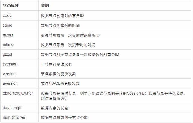 每个ZNode节点在存储数据的同时,都会维护一个叫做 Stat 的数据结构,里面存储了关于该节点的全部状态信息。如下: