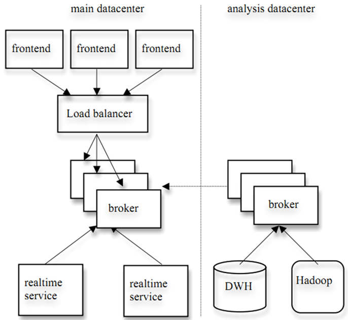 kafka 的设计目标之一就是同时实现离线处理和实时处理,根据这一特性,可以使用 spark/Storm 这些实时处理系统对消息在线处理,同时使用 Hadoop 批处理系统进行离线处理,还可以将数据备份到另一个数据中心,只需要保证这三者属于不同的 consumer group。如下图所示: