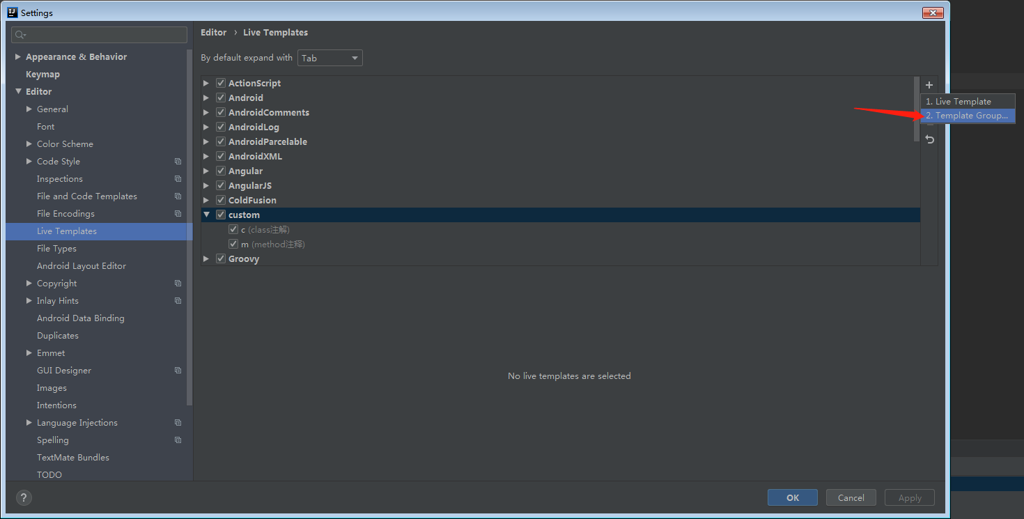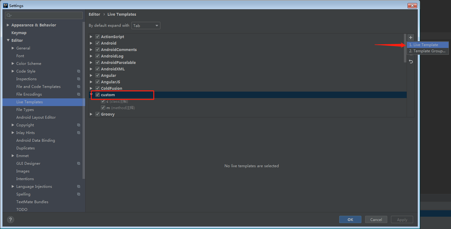 2、选中新增的Template Group,我这里叫custom,再点击右侧+号,新增Live Template
