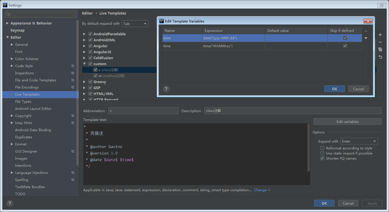 打开设置界面:File—>Setings—>Editor—>File and Code Templates