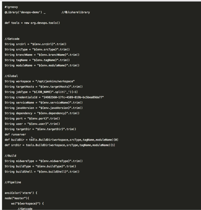 写pipeline的时候,前面一般定义是sharelibrary的库,下面是使用库里面的方法,再下面是日常定义的一些变量,在下面就是整个流水线的过程了。
