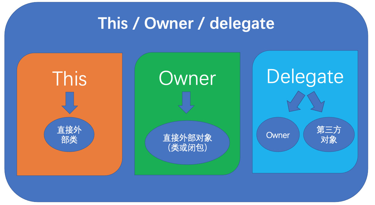 委托是groovy闭包的一个非常重要的特性。通过改变闭包的委托以及委托策略,我们可以设计出优雅的DSL。为了理解委托,我们首先来认识下闭包中的三个关键字: