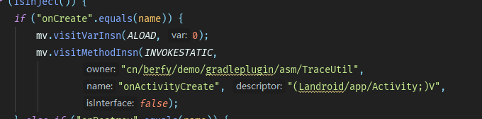具体的代码意思就是在onCreate方法开始执行的时候,插入cn.berfy.demo.gradleplugin/asm/TraceUtil.class类中的onActivityCreate的方法中的内容。具体可以学习下ASM语法和JVM字节码说明。