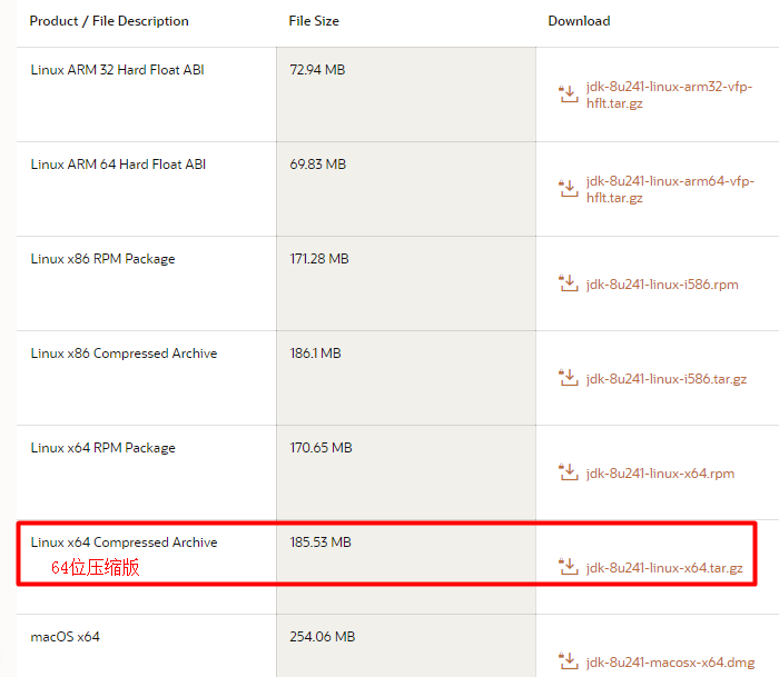 注意:这里需要下载 Linux 版本。这里以jdk-8u151-linux-x64.tar.gz为例,你下载的文件可能不是这个版本,这没关系,只要后缀(.tar.gz)一致即可。