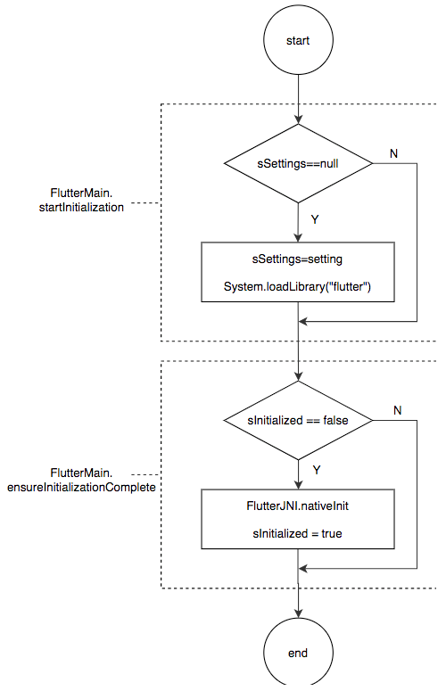 原有的Flutter引擎初始化由FlutterMain类的两个方法完成,分别为startInitialization和ensureInitializationComplete,一般在Application初始化时调用startInitialization(懒加载模式会延迟到启动Flutter页面时再调用),然后在Flutter页面启动时调用ensureInitializationComplete确保初始化的完成。